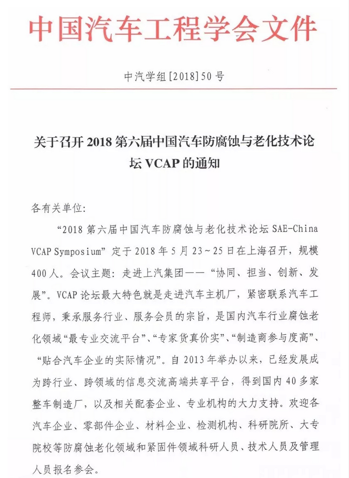 “2018第六屆中國汽車防腐蝕與老化技術論壇SAE-China VCAP Symposium”定于2018年5月23~25日在上海召開,規模400人。
